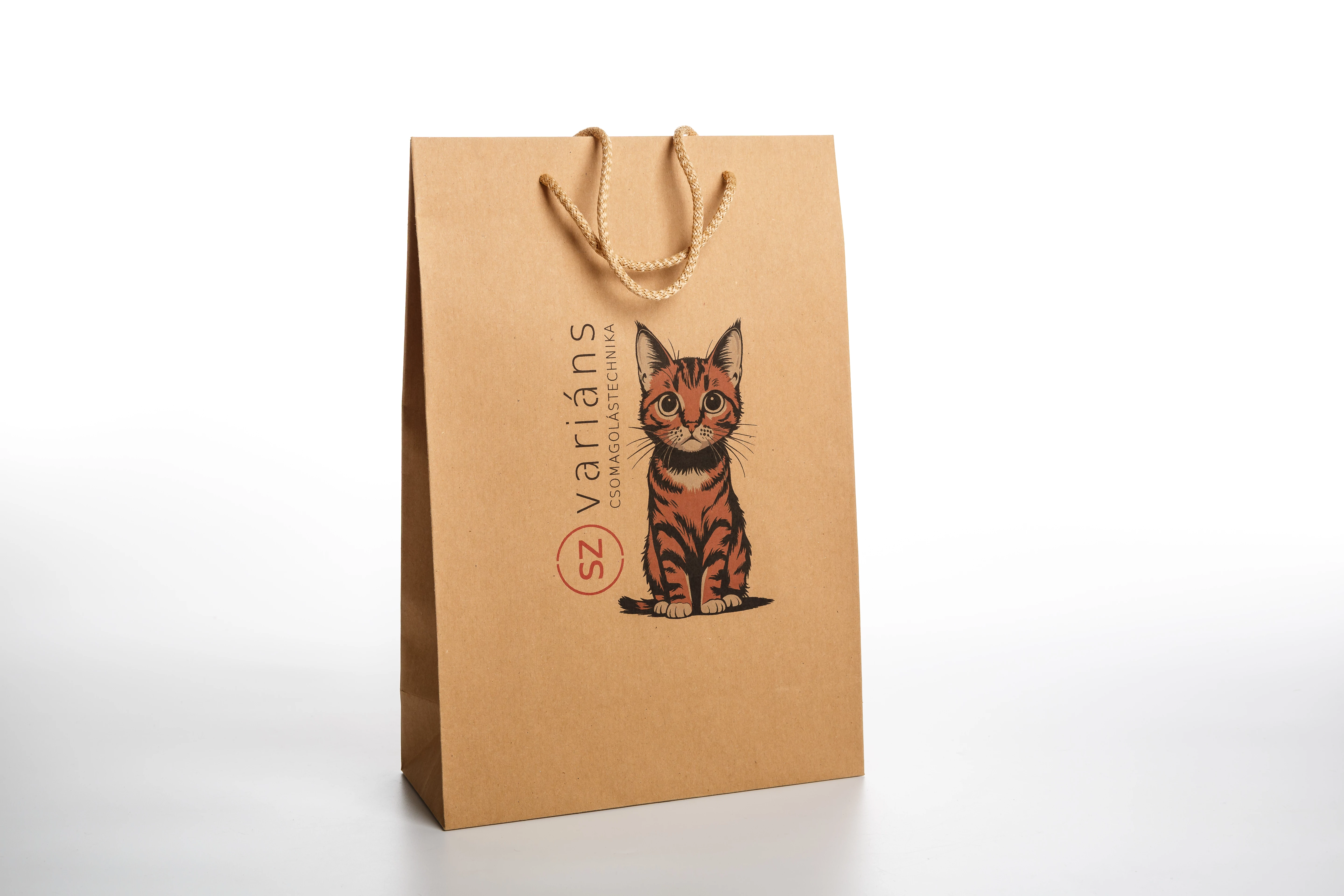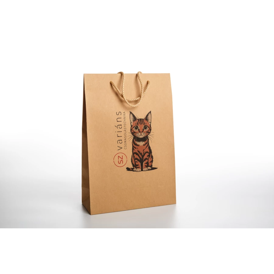 Nagy méretű, elegáns kivitelű papírtáska, mely zsinórfüles megoldással kiváló teherbíró képességgel bír.